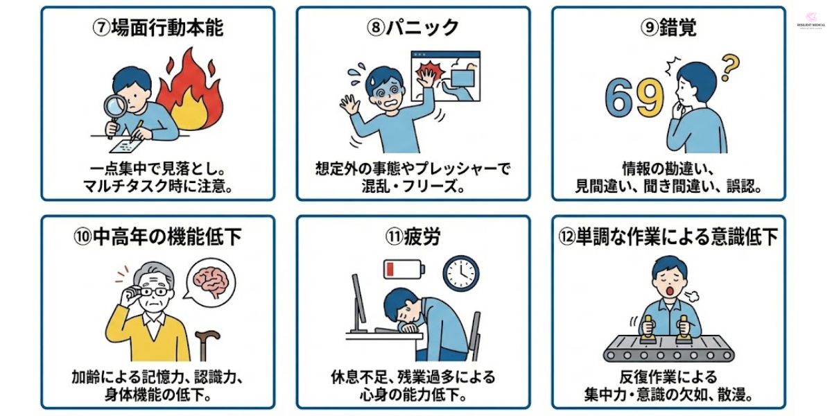 - 錯覚: 正しい情報を勘違いするエラー。連絡不足とも関連があり、注意喚起が必要。