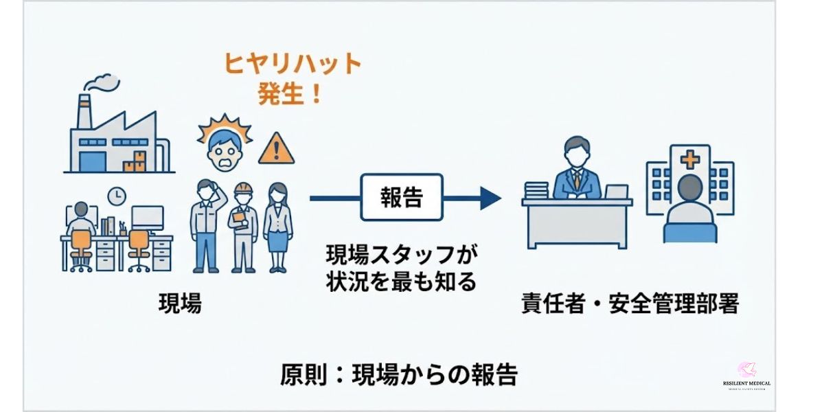 ヒヤリハット事例の収集は以下の図で示すように、原則的に現場からの報告という形で行います。