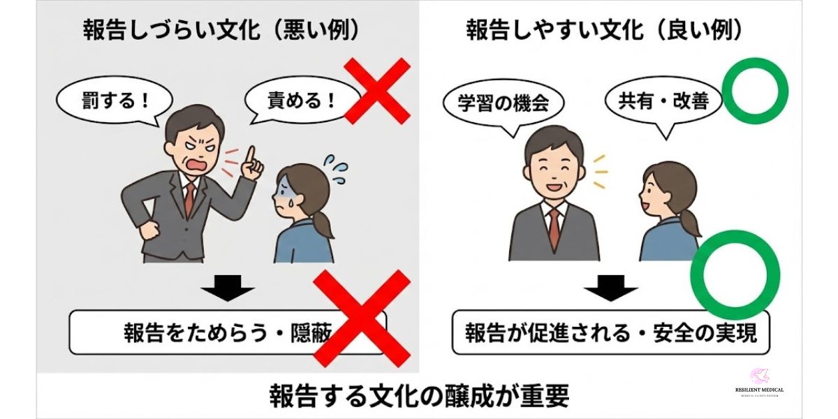 ヒヤリハットの事例を収集するためには報告しやすさを最大化し、報告のしづらさを最小化することが重要です。そのためには、ヒヤリハットを罰したり、個人を責める組織文化を変化させる必要があるのです。