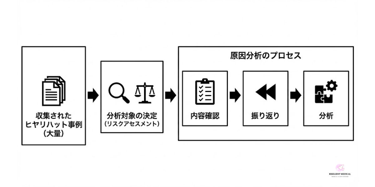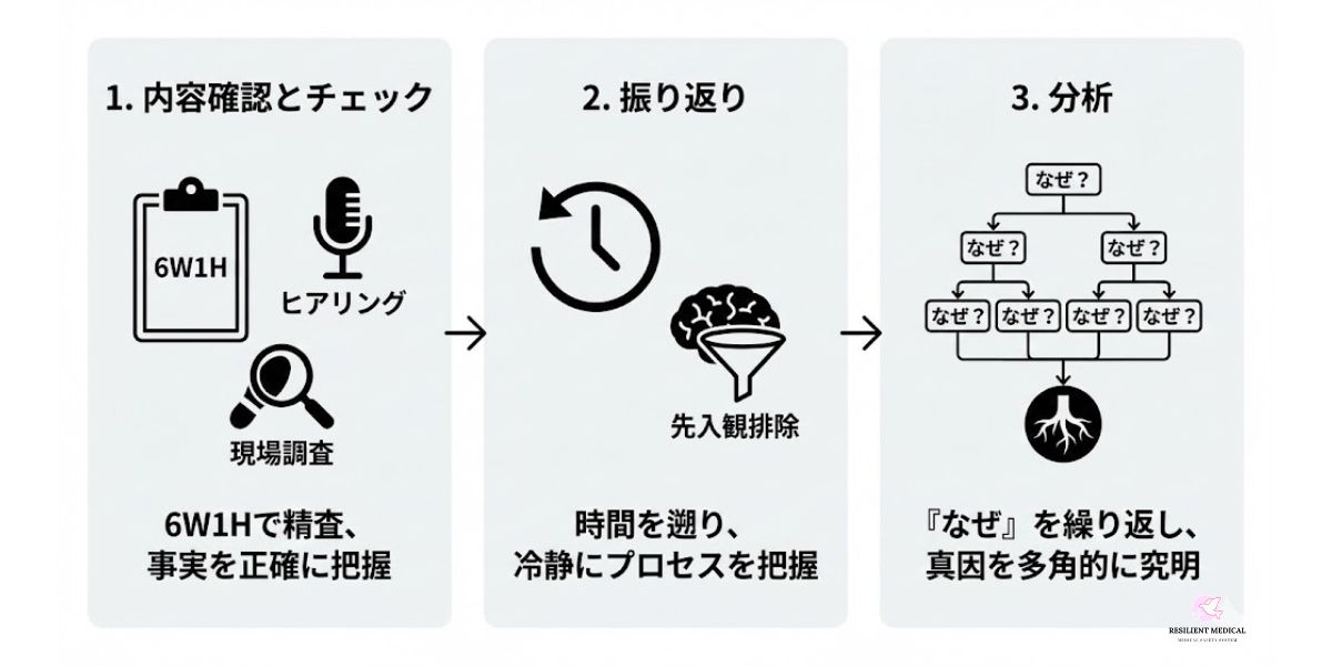 ヒヤリハットの内容を把握できたら、なぜそのような事態になったのかを時間を遡って振り返る必要があります。