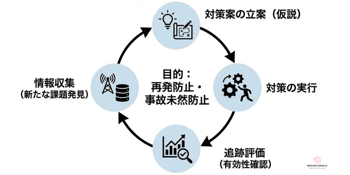 ヒヤリハットの原因分析で明確になった問題に対して、どのような対策を行っていくか。そのためには対策の計画を立て実行にうつしていく必要があります。この段階では対策立案はあくまでも仮説であり、真に有効な対策であるか否かは、対策の実行後に追跡評価することで明確になってきます。