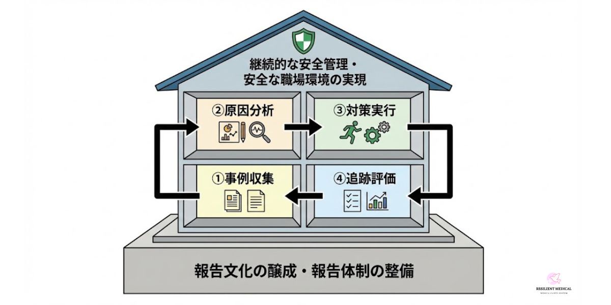 ヒヤリハットの原因分析と対策にとって重要なことは、これら一連の流れがシステムとして機能し、継続的に安全を管理することです。したがって、報告する文化の醸成と報告体制の整備は欠かせないものであり、それを組織全体で共有し徹底していくことが大切です。