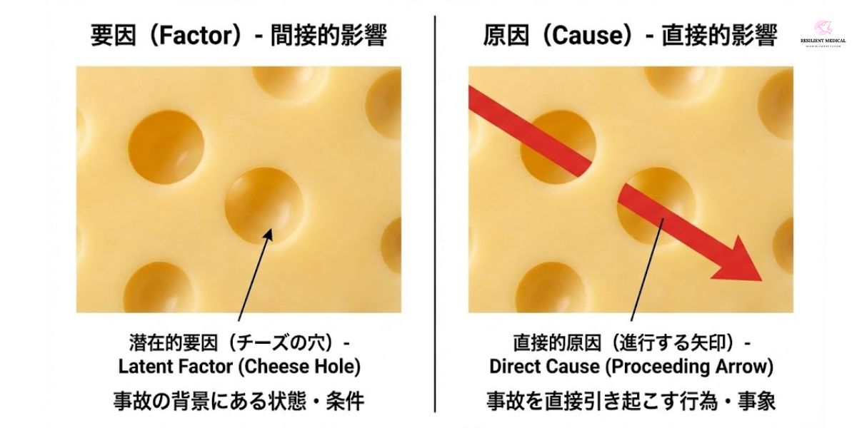 「要因」とは結果に対して間接的に影響を与えるものです。一方で「原因」とは結果に対して直接的に影響を与えるものです。スイスチーズモデルで例えるとチーズの穴が潜在的要因であり、チーズの穴を通過して進行する矢印が即発的エラーです。