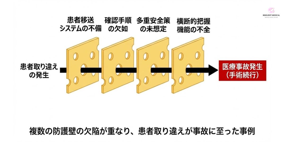 医療事故の概要は、手術室への患者受け渡しの際に起きた患者の取り違えがその後も見逃され、麻酔と手術が続行されたという事故です。この事故のケースでは複数の防護壁を次々とすり抜けており、まさにスイスチーズモデルが現実となった典型的な事例といえるでしょう。