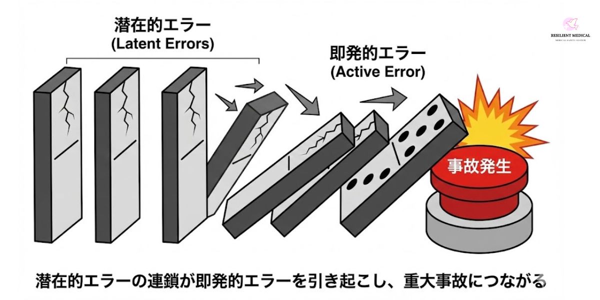 この医療事故のように、事故に至る過程には複数のエラーが連鎖していることが多く、その背景には組織における脆弱性を生み出している潜在的要因が潜んでいることが多いのです。