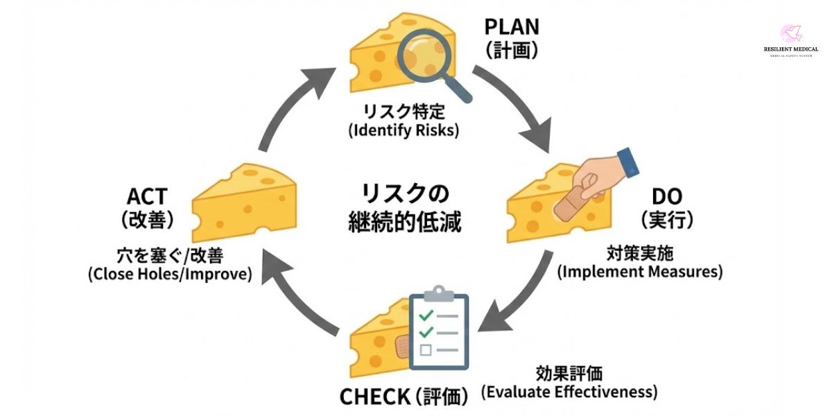 そのため、医療における安全も、看護における安全も、多重の防護策を立てると同時に、レジリエンスを高めていくことが大切です。そのためには継続的な安全活動のPDCAサイクルを回し、絶え間のない安全管理に努めることが必要です。