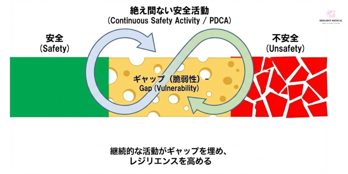 安全の対義語は「危険」ではなく「不安全」です。そのため、安全と不安全とのギャップを日頃から自覚し、そのギャップを無くすための活動の中にこそレジリエンスを生み出す要因があるのです。スイスチーズの穴とは、この安全と不安全の間にあるギャップであり、その脆弱性を危険は好みます。