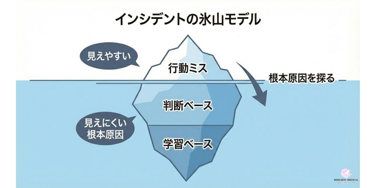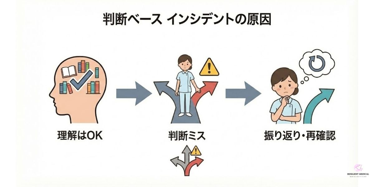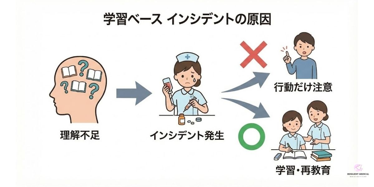 この学習ベースのインシデントは、インシデントが発生した業務について、そもそも理解が不十分な場合に発生します。そのため、学習ベースのインシデントは新人看護師に多くみられる傾向があります。