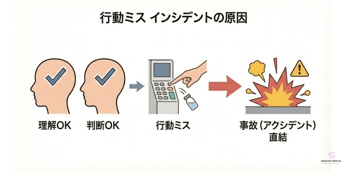 また、この「行動ベース」のインシデントは、事故に直結しやすいパターンです。なぜなら、行動はすぐに結果につながるためです。理解不足や判断ミスは、事前に周囲の人間が間違いに気づく猶予があります。しかし、行動段階でのミスは周囲が気づいたときには、誤った行為が行われた後となっているかもしれません。