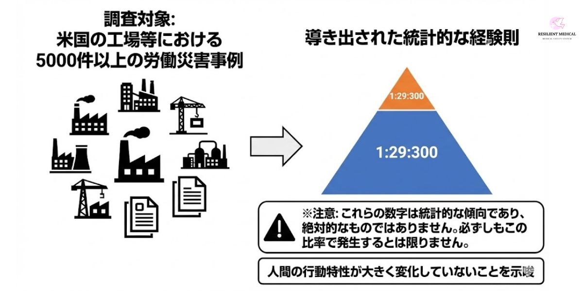 ハインリッヒの法則の根拠は、米国の某工場において発生した5000件以上の労働災害を調査した結果に基づいています。「1:29:300」という数字は、その調査で導き出された統計的な結果に基づいており、必ずしも絶対的な数字ではありません。
