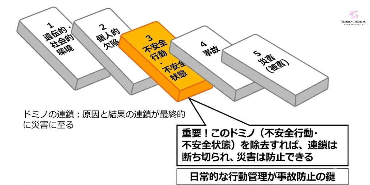 ハインリッヒのドミノ理論とは、事故や災害に至るプロセスを原因と結果の連鎖として説明した理論です。