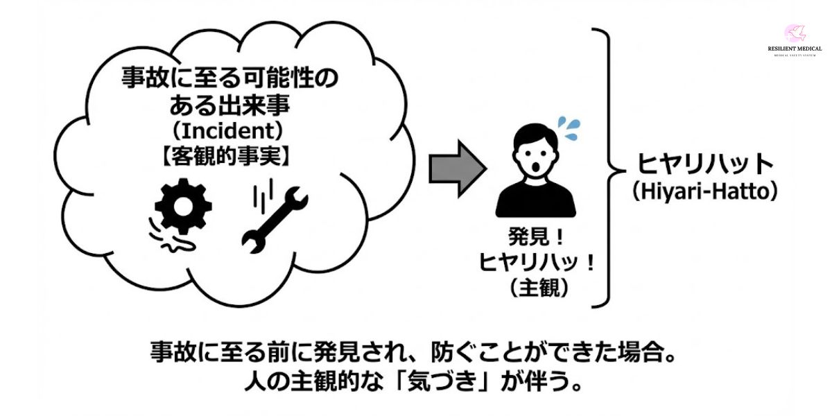類語に「インシデント」という言葉があります。インシデントはヒヤリハットとほぼ同義として扱われています。しかし注意が必要なのは、ヒヤリハットとは事故に至る可能性のあった出来事の「発見」であって、出来事そのものはインシデントです。