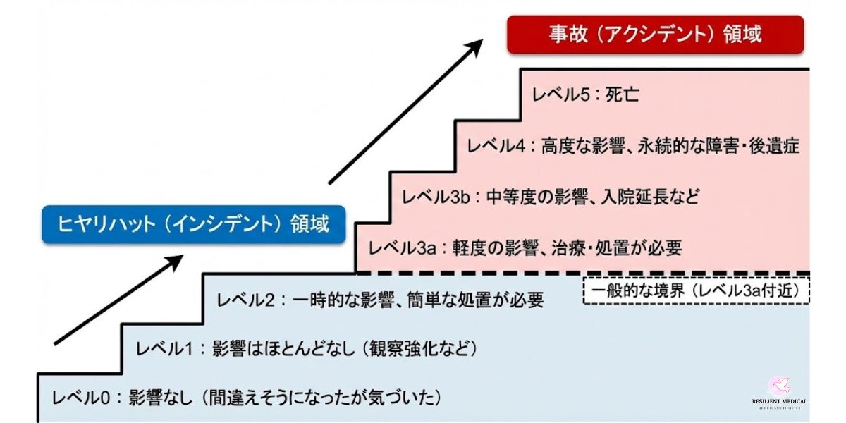 以下の図は、医療におけるヒヤリハットと事故との境界をレベルごとに分類した事例です。