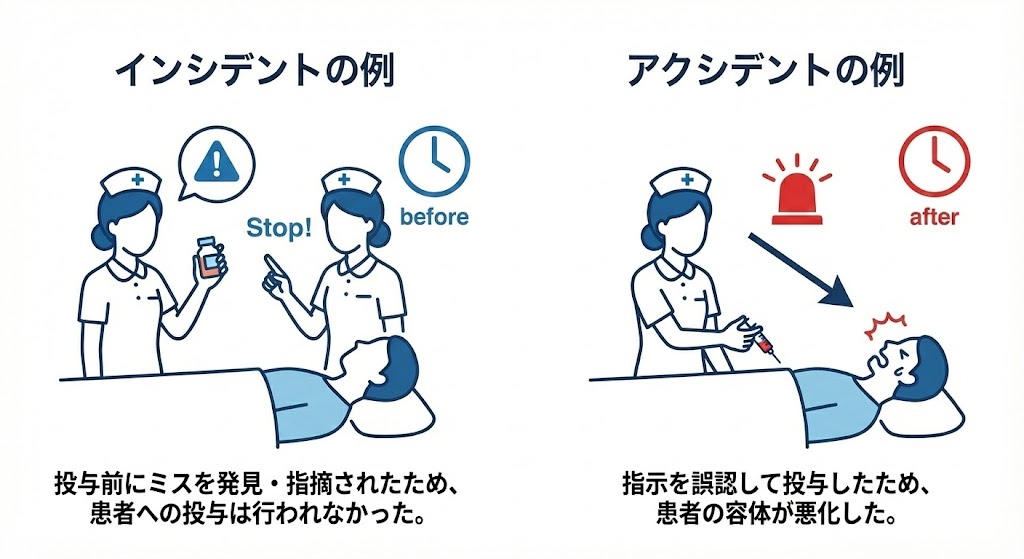 例えば、看護師が患者に誤った薬剤を投与しようとしたが、同僚が気づいて指摘し、患者に影響がなかった場合は「インシデント」。逆に、誤った薬剤の投与により患者の容体が悪化した場合は「アクシデント」となります。