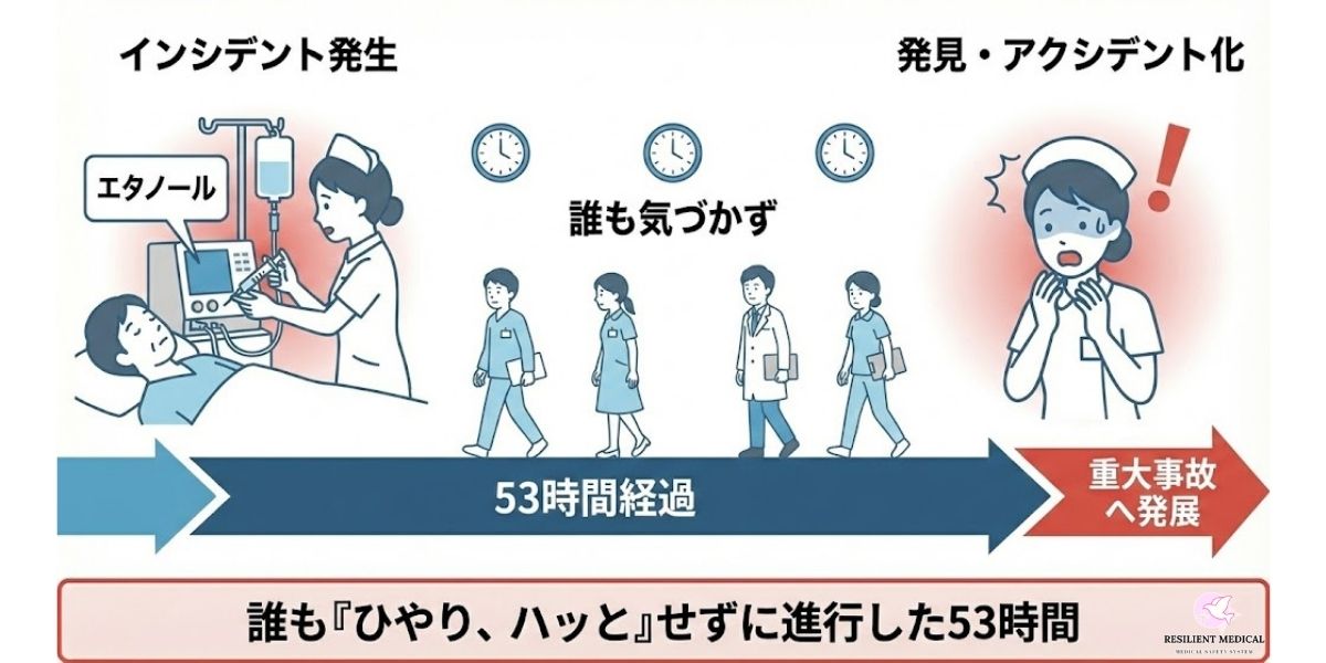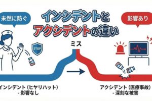 しかし、おそらく先輩看護師は、エタノールを発見したとき「ひやり」もしくは「ハッと」したはずです。つまりヒヤリハットです。もし仮にヒヤリハットとインシデントが同義なら、エタノールを53時間注入された患者がいても事故ではなくインシデントということになるのではないでしょうか?このケースでは、アクシデントにまで至った段階でヒヤリハットしているのです。