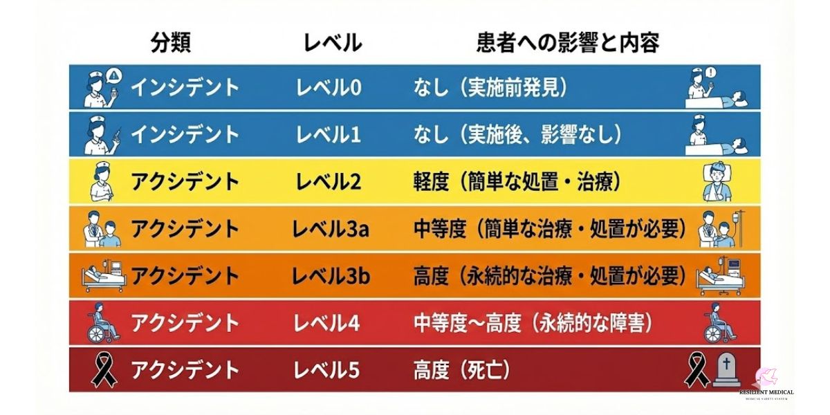 この患者影響レベルの分類では、多くの医療機関がレベル2の前後でインシデントとアクシデントを区別します。