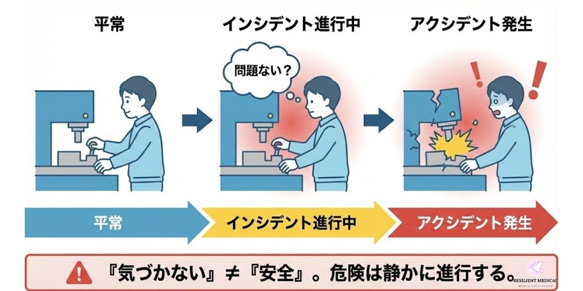 なぜなら、インシデント=ヒヤリハットという認識によって、「ひやり、はっと」しない状態を、人は安全もしくは平常状態だと誤認をする可能性があるからです。
