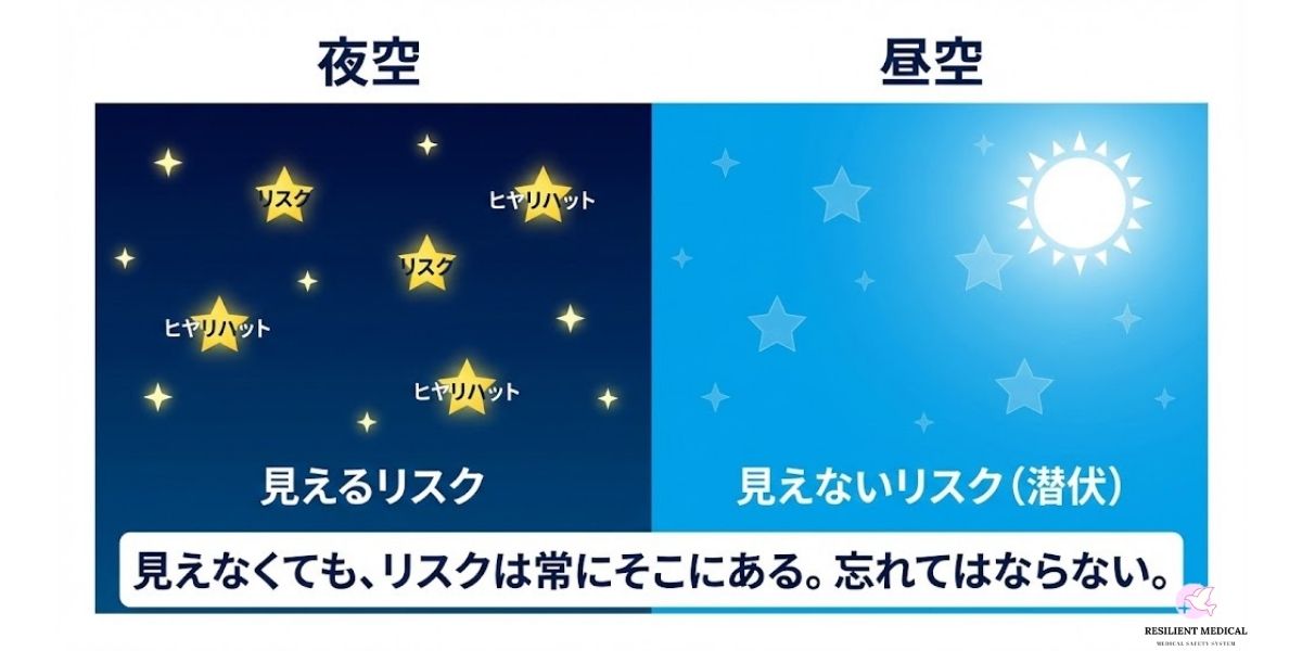 たとえ誰も「ひやり」とも「ハッと」もしなくても、インシデントは起きている可能性があるということです。