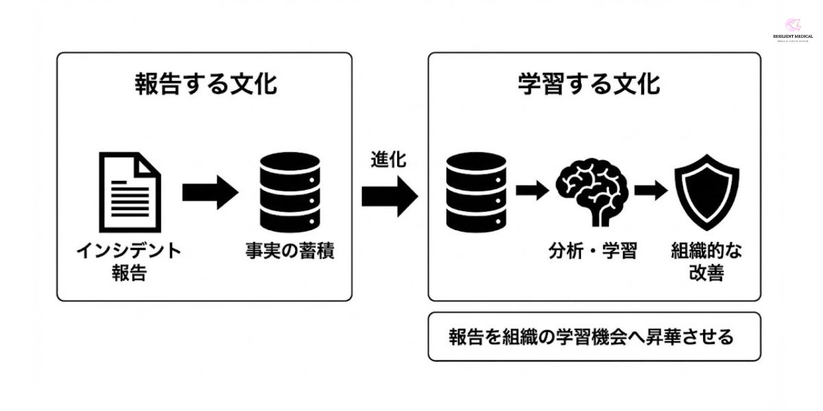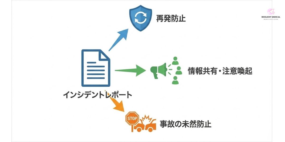 インシデントを医療安全のために報告することは、事実を報告するだけでなく、重要な学習の機会でもあります。インシデントの報告を通じて、組織全体が再発防止や未然防止に向けて学びを得ることが期待されます。