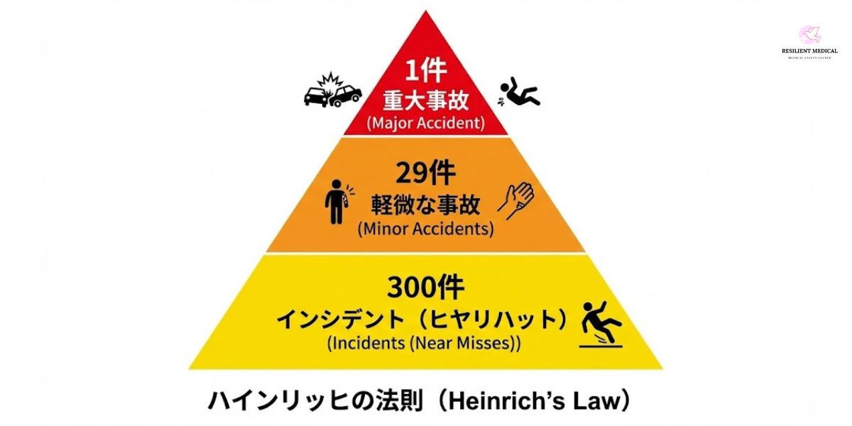 インシデントと事故との関係を数値化したものにハインリッヒの法則があります(下図)。1件の重大事故の背後には29件の軽微な事故があり、さらにその背後には300件のインシデント(ヒヤリハット)が存在するとしたものです。