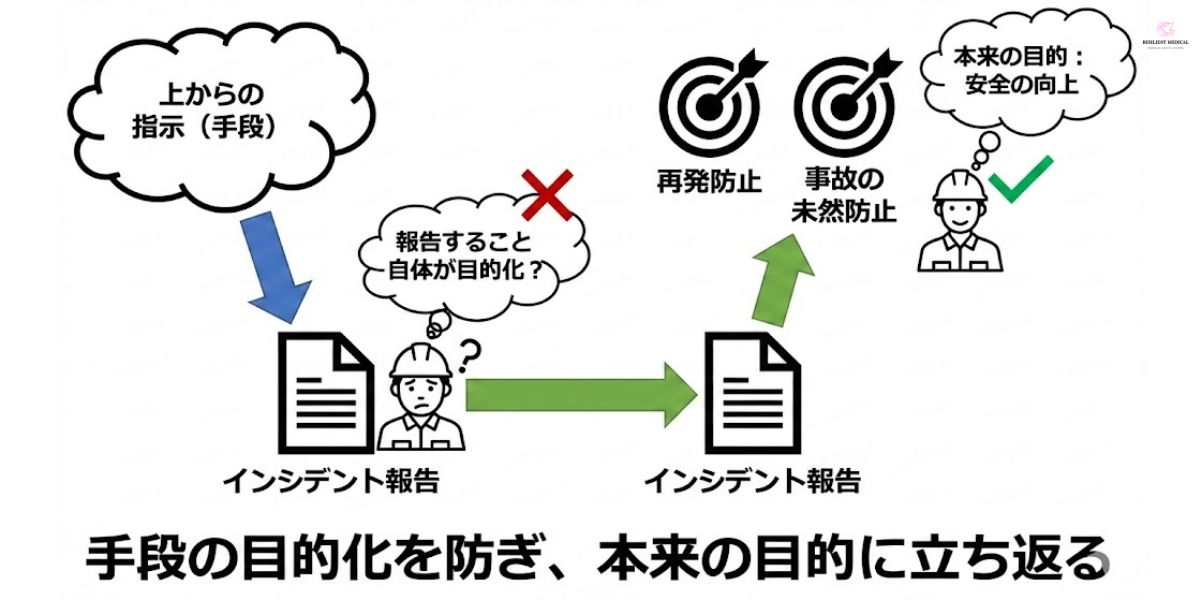 インシデントを医療安全のために報告することは、ただ事実を報告するだけが目的ではなく、インシデントの再発防止や事故を未然に防ぐための重要な学習の機会でもあるのです。