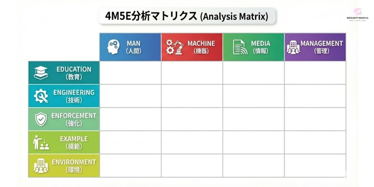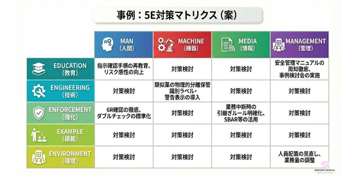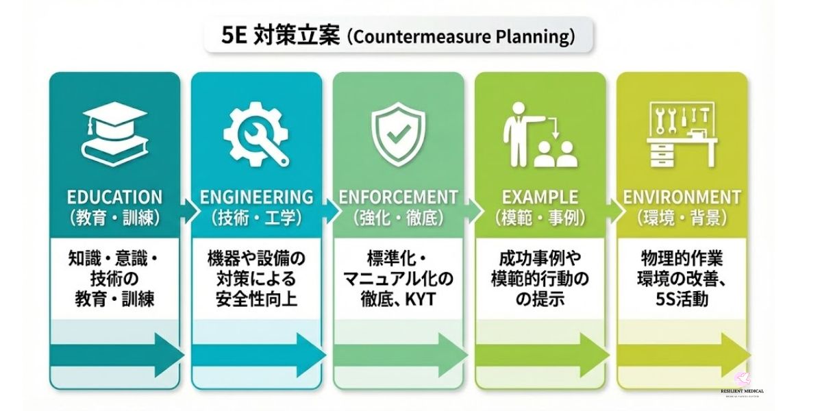 インシデントやアクシデントなどの有害事象が発生した場合は、4Mの視点から要因(あるいは原因)を分析します。そして、その4Mの要因に基づいて、今度は5Eの視点で対策を立案し実行します。