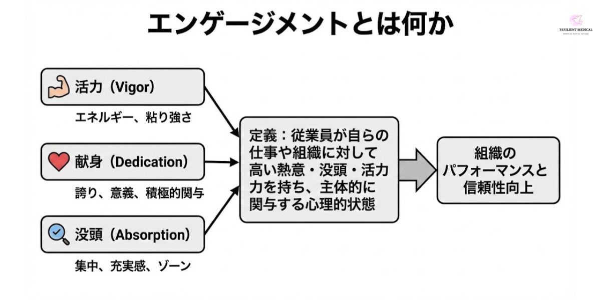 単なる職務満足度や一時的なモチベーションとは異なり、エンゲージメントは能動的かつ持続的な貢献意欲を伴う点が特徴である。従業員が組織に愛着を持ち、目標達成に向けて自律的に取り組むことで、組織全体のパフォーマンスと信頼性が高まる。