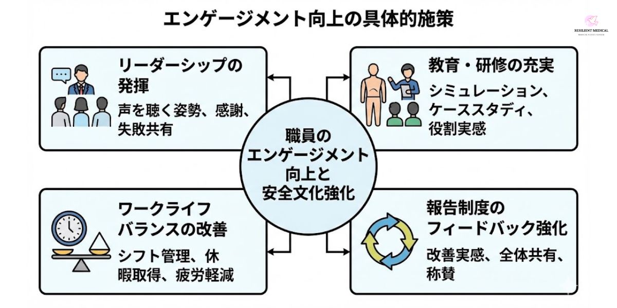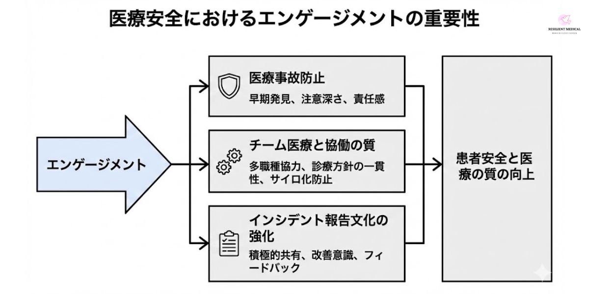 エンゲージメントは、医療従事者の意欲や責任感を高めるだけでなく、医療事故の予防・多職種協働の質向上・インシデント報告の促進といった医療安全の中核要素を支える役割を担っている。したがって、医療機関がエンゲージメントを高める取り組みを行うことは、患者の安全を守る最も実践的な戦略の一つといえる。