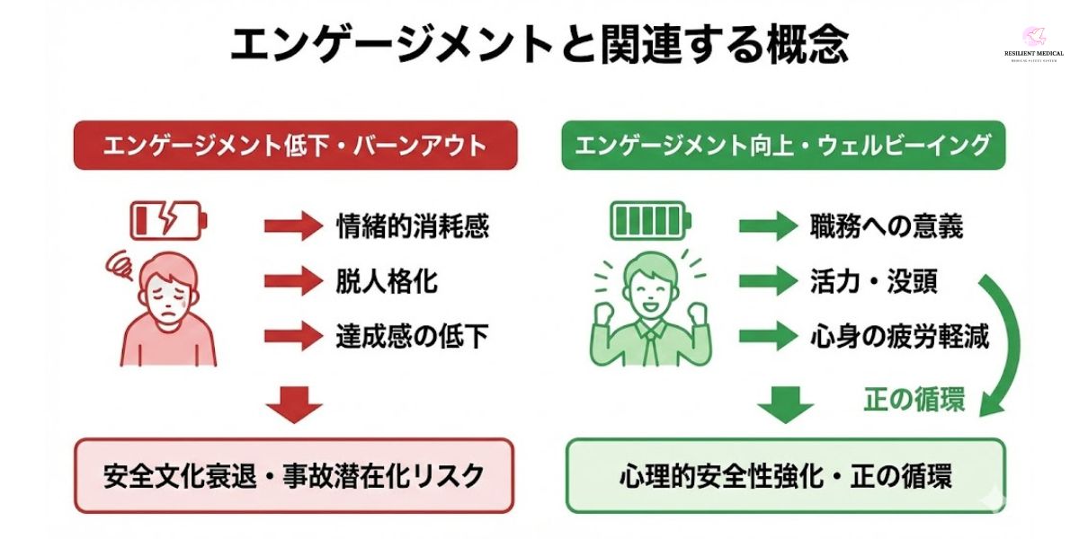 この比較からも明らかなように、エンゲージメントは医療安全文化の「推進力」として機能し、逆に低下すればリスクが増幅する「危険信号」となる。