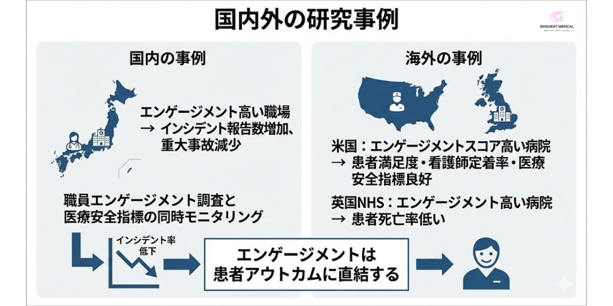 また、一部の病院では「職員エンゲージメント調査」と「医療安全指標」を同時に追跡し、両者の関連性をモニタリングしている。結果として、エンゲージメントが改善した部署では「転倒・転落」「投薬エラー」などのインシデント率が低下した事例が報告されている。
