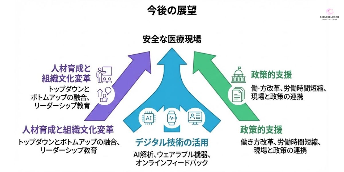 今後は、政策レベルでの支援と現場の実践が相互に補完し合い、組織的な働き方改革がエンゲージメント強化→医療安全向上へとつながる好循環を形成することが期待される。