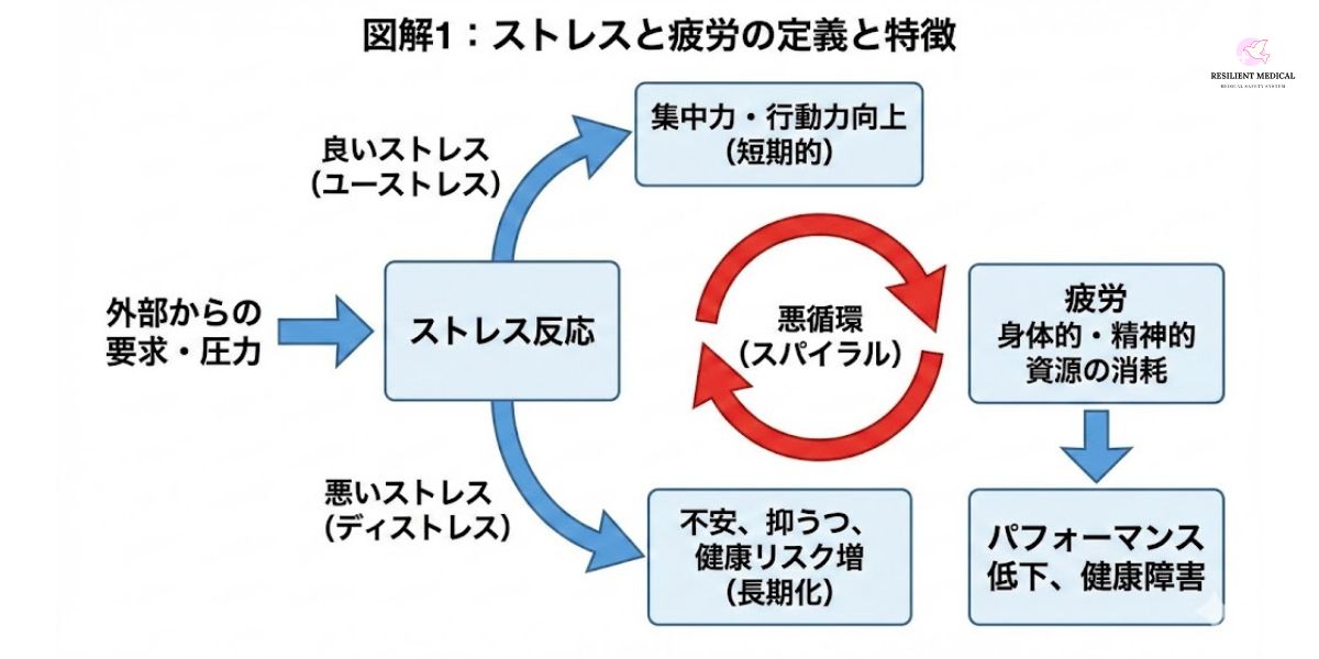 つまり、ストレスと疲労は密接に関連し、相互に悪循環を形成する。過度のストレスは疲労を加速させ、回復できない疲労はさらなるストレス反応を引き起こす。このサイクルを断ち切るためには、日常的なセルフマネジメントと組織的なサポートが不可欠である。
