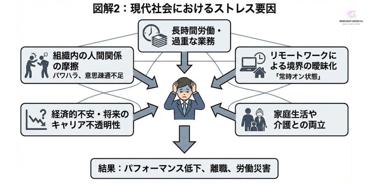 現代社会では、ストレスや疲労の原因が多様化し、複合的に作用している。主な要因を以下に整理する。