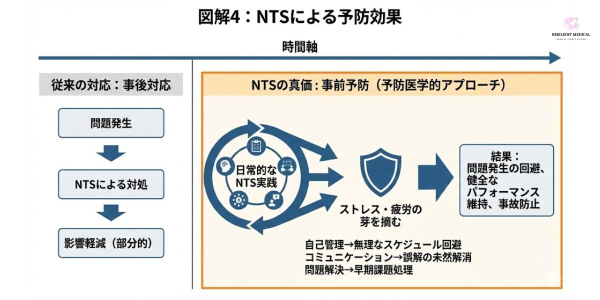 このように、NTSは「事後対応」だけでなく「予防医学的アプローチ」としても重要である。特に医療・航空・建設など高リスク領域では、事前の予防が事故防止に直結するため、NTSの教育は不可欠とされている。