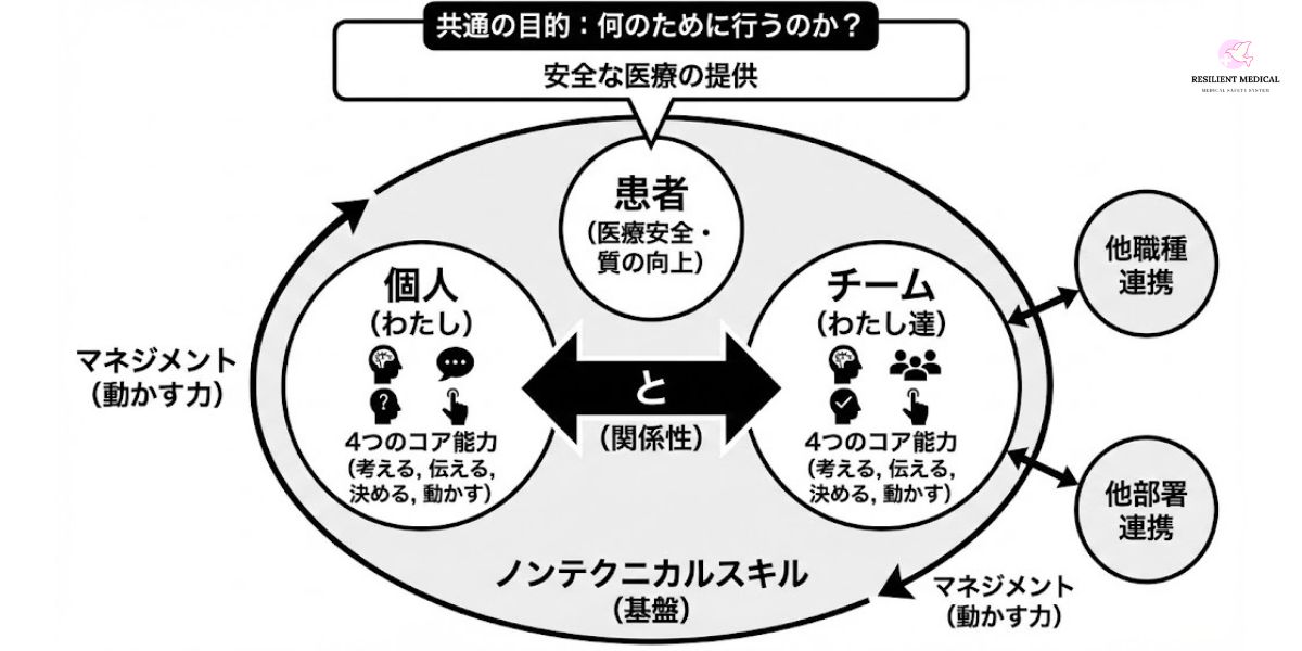 中心に患者の存在があり、個人とチームはそのために医療を安全に提供することが求められます。また、他職種とのつながり、あるいは他部署とのつながりも重要です。