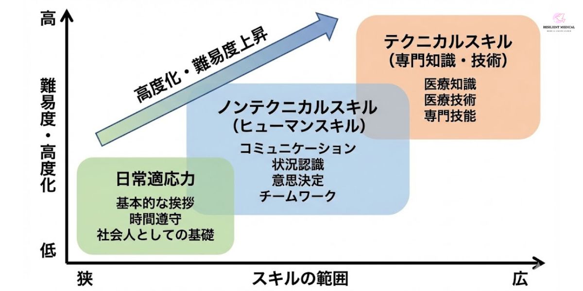 右上にいくほどスキルは高度化していき、なおかつ難易度も高いものとなっていきます。また左下の日常適応力とは、ごく基本的なコミュニケーションや時間の遵守等、社会人として極めて基本的な能力となります。
