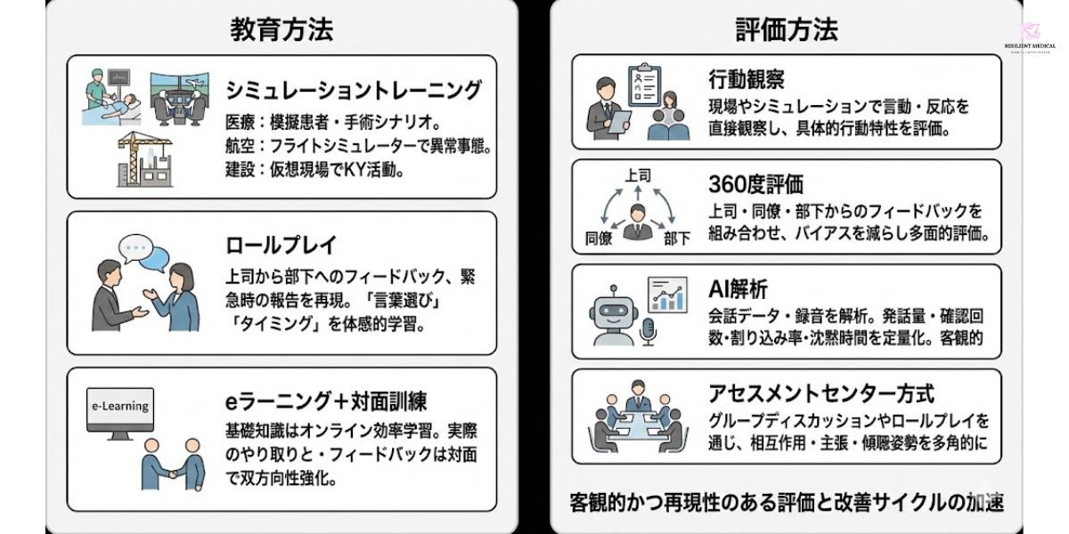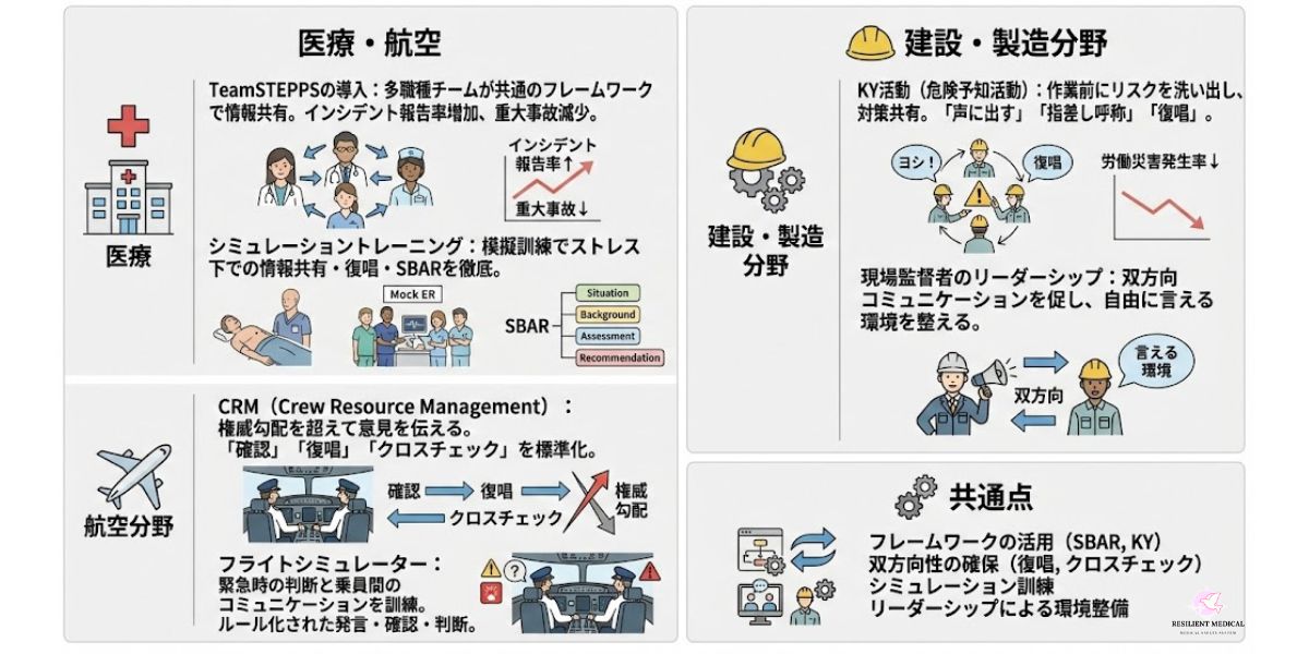 医療の TeamSTEPPS や航空の CRM(Crew Resource Management) は、すでに世界的に普及しつつあり、近年はその知見が他産業へ応用されている。
