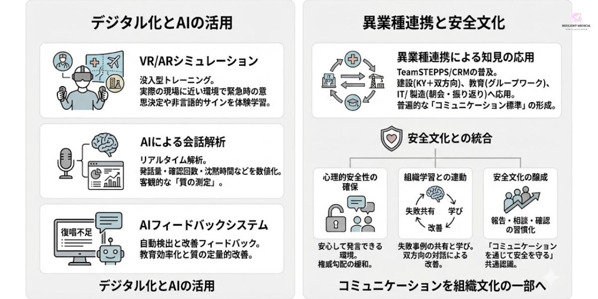 例えば、医療現場でのハンドオーバー時にAIが「復唱の不足」や「重要情報の省略」を自動検出し、改善フィードバックを提供するシステムが試験導入されている。