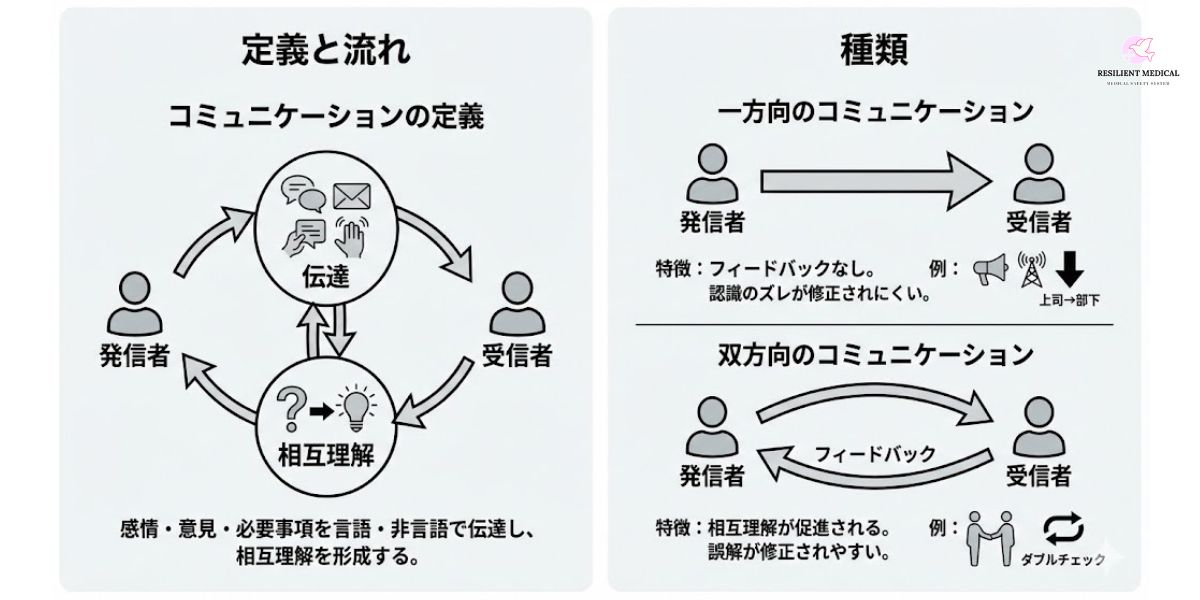 コミュニケーションとは、感情・意見・必要事項を言語・非言語を通じて他者に伝達し、相互理解を形成すること。