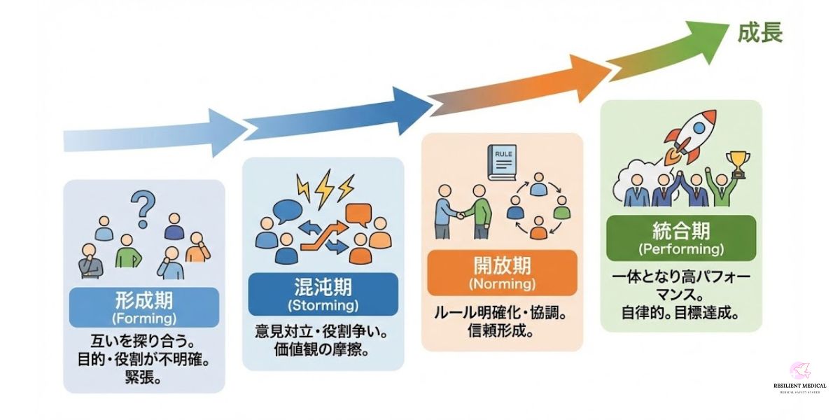 心理学者ブルース・タックマン(Bruce W. Tuckman, 1965)は、チームが発展していく過程を段階的に示す「チーム発達モデル」を提唱した。この理論はその後、医療安全、プロジェクトマネジメント、教育分野など幅広い場面で活用されている。特に、「チームワークは自然に成立するのではなく、段階的に成長する」という視点を提供した点で画期的であった。