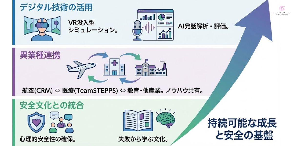 これらは国際的に確立されたトレーニングモデルであり、今後は建設・製造・教育分野など、他の領域への展開が期待されている。例えば、教育現場では教師とスタッフ間の協働にCRMの手法を応用する試みが始まっており、生徒への対応力や教育の質の向上につながっている。