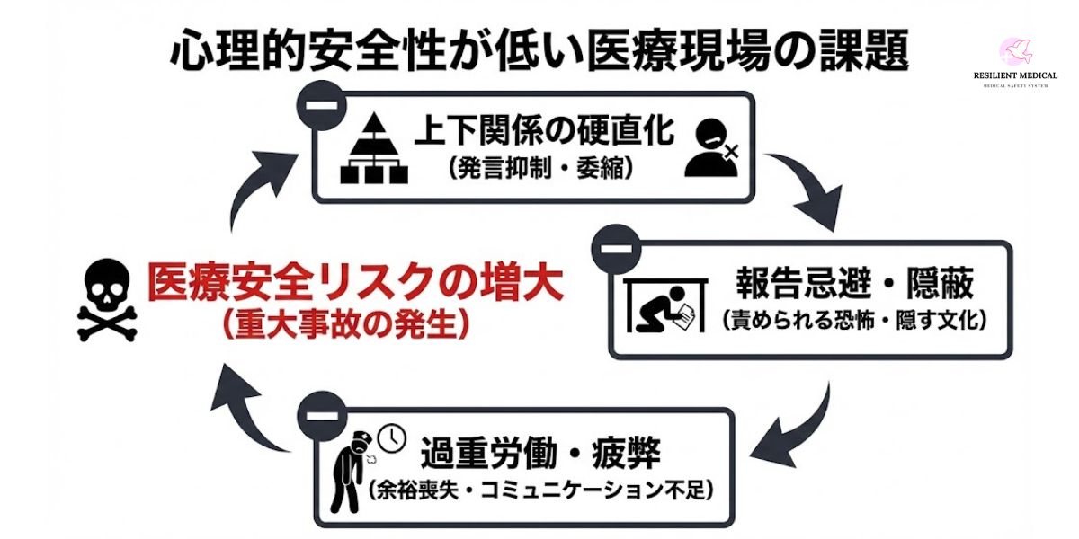 といった複数の課題が存在する。これらは相互に関連し合い、組織全体の安全性を大きく損なう。医療現場の心理的安全性を高めることは、単に「雰囲気を良くする」ためではなく、患者の生命を守る最重要課題である。