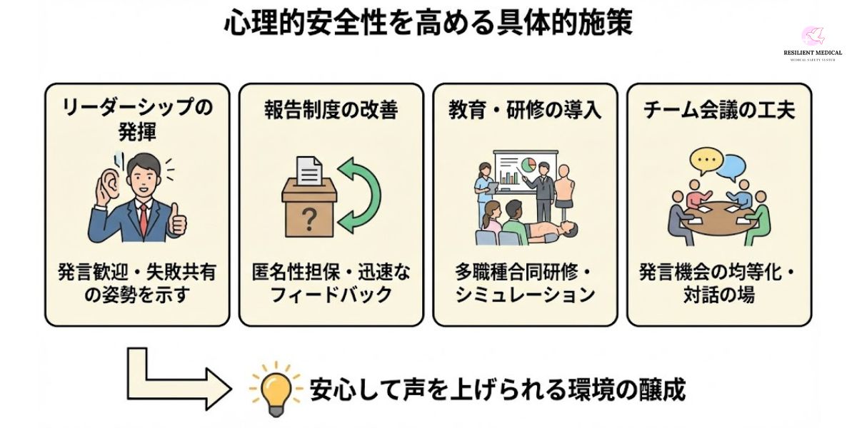 心理的安全性を高める施策は、リーダーの態度、報告制度の工夫、教育研修、会議運営の改善と多層的である。これらを組み合わせることで、**「誰もが安心して声を上げられる環境」**が形成され、結果として医療事故防止や患者安全の向上につながる。