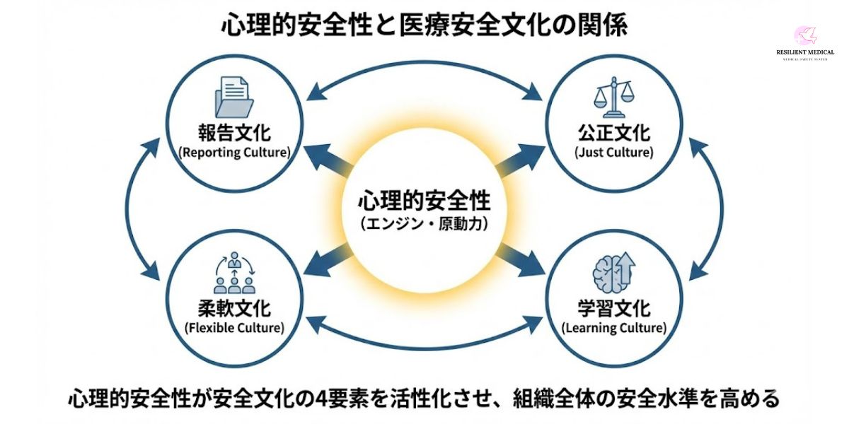 心理的安全性は、James Reasonが提唱した「安全文化(Safety Culture)」の4要素(報告文化・公正文化・柔軟文化・学習文化)と密接に関連している。医療現場において心理的安全性が確立されると、この4要素が相互に強化され、組織全体の安全水準が高まる。