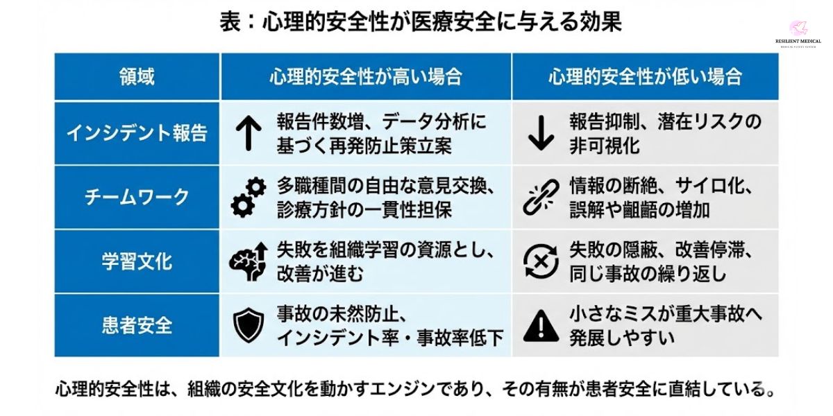 心理的安全性は、単なる「職場の雰囲気」ではなく、医療安全の成果指標に直接影響を与える要因である。以下の表は、心理的安全性の有無が医療現場に及ぼす違いを整理したものである。