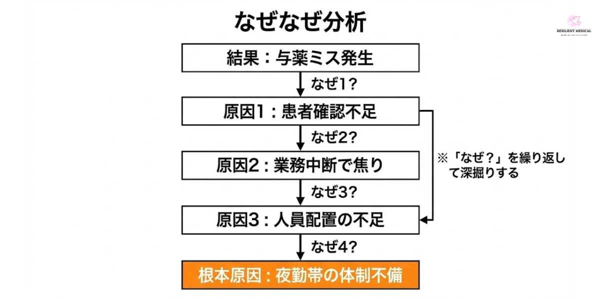 出来事流れ図を作成したら、次に「なぜなぜ分析」を行っていきます。