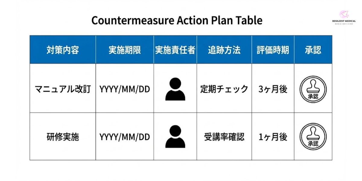 対策立案表には対策の内容だけではなく、実施に期限を設定し明記する必要があります。また、実施にあたっての責任者、実施の追跡方法、評価の時期も明記し管理者の承認を受けることが大切です。