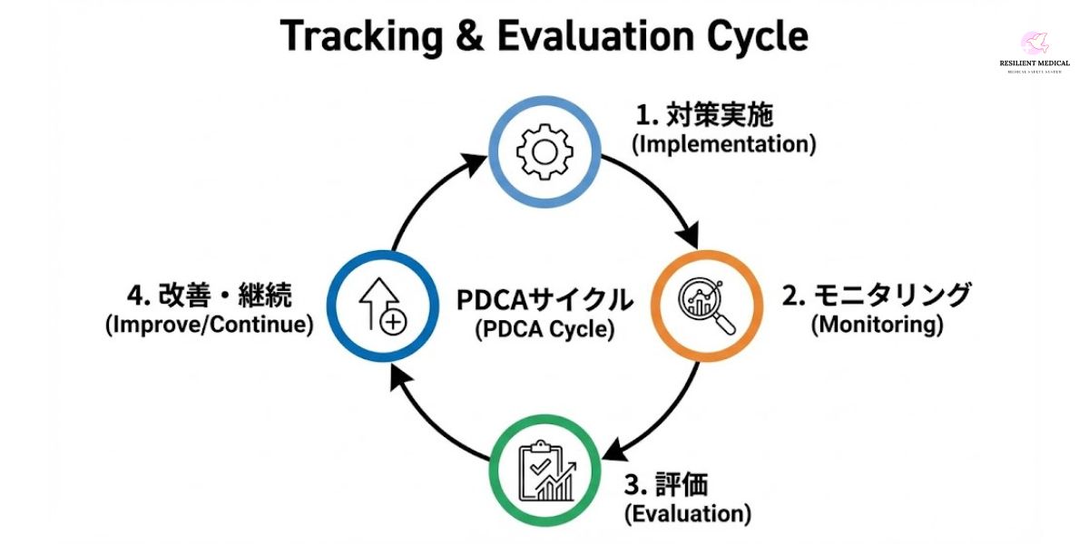 対策を実施した後に、その状況を追跡することは極めて重要です。対策を実施したことで満足し、その後に何の追跡も評価もしなければ意味がありません。