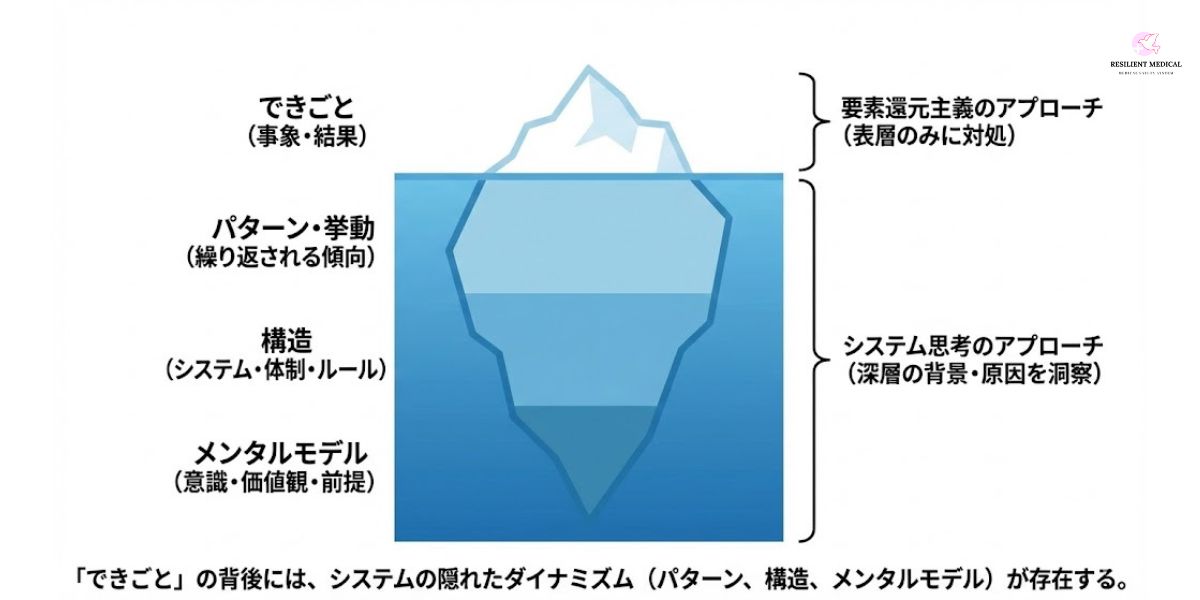このように「できごと」には、多くの背景があり、それが事象として可視化されたものといえるでしょう。そして要素還元主義的な分析は、ときにこの全体像を見落としやすくなるわけです。事象を分析するということが、氷山の一角を全体と認識してしまう可能性があるのです。