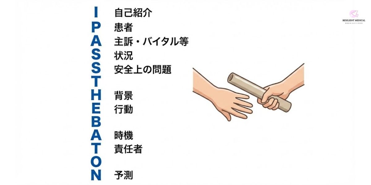 「HAND OFF(ハンドオフ)」とは、業務の引継ぎのことです。Team STEPPS®におけるハンドオフは、アメリカンフットボールで直接ボールを味方の選手に手渡すところからきています。また、安全に業務の引継ぎを行うための要点となる10項目の頭文字をとった「I pass the baton」(バトンを渡す)が推奨されています。